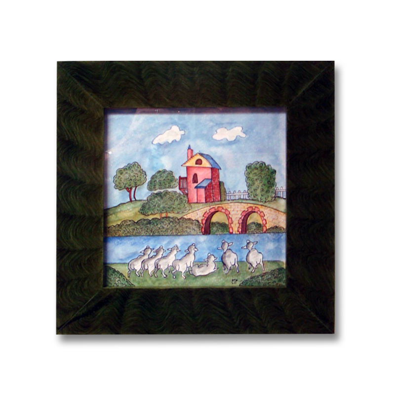 Seven Sheep Overlooking House and Bridge | 11 3/4" x 11 3/4"